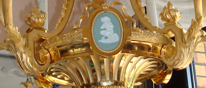 Die Deckenlampe wurde vervollständigt. Es wurden Teile ergänzt. Danach wurde sie aufgearbeitet und neu vergoldet.